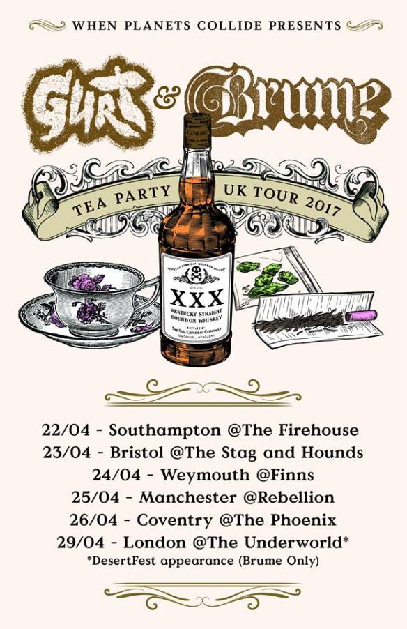 When Planets Collide is proud to present a tour of mammoth proportions, bringing together UK Party doom troop GURT and San Francisco Doom Metal trio BRUME who venture to UK soil for the first time. With these 2 WPC bands united for the first time we truly aim to bring the ying and yang of heavy music and cover all ground on what will be 5 days of crushingly heavy music and fun times. After which BRUME shall be going it alone for one final show appearing on the Saturday of this year’s DESERTFEST London on the HDP/WPC stage.
